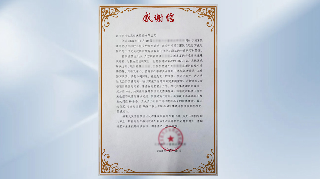 近期,在航天科工集团某研究所的 PDM与MES集成开发项目中,开目技术运维团队在面临项目进入决胜攻坚战的关键时刻,顶住压力,勇挑重担,为客户解决了多年来数据不规范的痛点问题以及其它部门提出的80多项关键问题,确保了项目的圆满完成。运维团队的专业性和责任心,获得了客户高度肯定和赞扬。