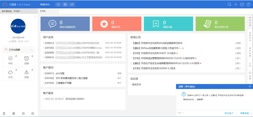 ◉ 高效快捷的运维服务平台:为了建立高效快捷的沟通渠道,开目为老用户搭建了运维服务平台。企业拥有独立账号,登录可随时查看常见问题处理方案,也可自行在平台上反馈问题,开目运维中心收到问题后,第一时间协调安排技术人员现场或远程指导解决。企业可通过平台实时关注问题处理进展情况,实行闭环监督管理。