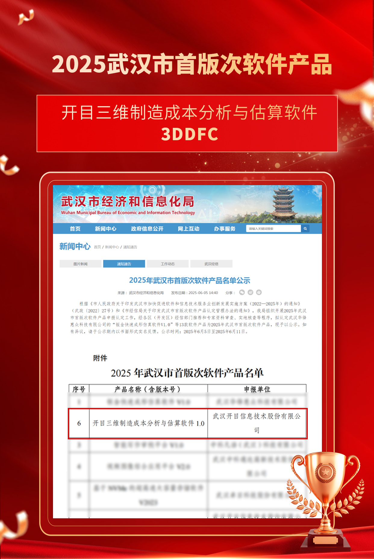 近日,2025年武汉市首版次软件产品名单正式公布,经武汉市经济和信息化局严格评审,英国正版365官方网站自主研发的“三维制造成本分析与估算软件3DDFC”凭借领先的技术实力、成熟的市场落地与完善的自主知识产权体系,成功入选。