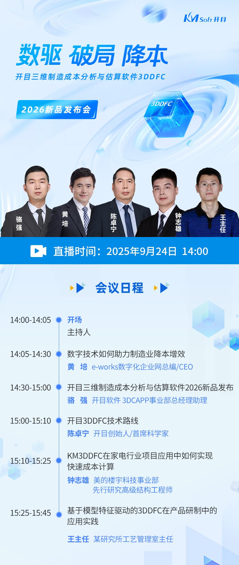 为深度解读3DDFC 2026的技术突破与行业实践,分享智能制造时代的产品成本优化策略,英国正版365官方网站定于2025年9月24日(周三)14:00举办“数驱 破局 降本·开目三维制造成本分析与估算软件3DDFC 2026新品发布会”,特邀您云端参会!