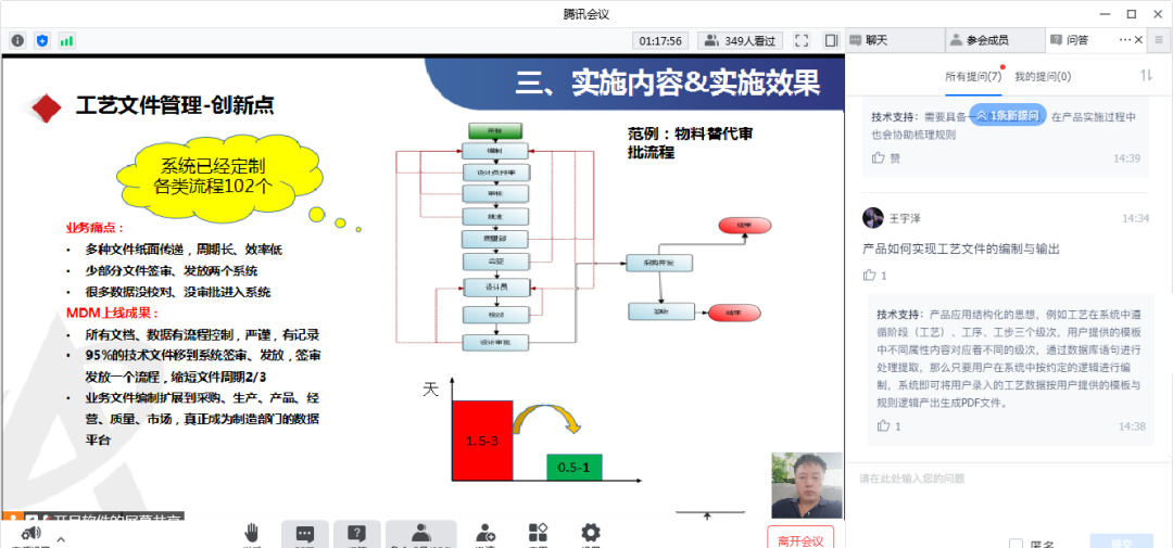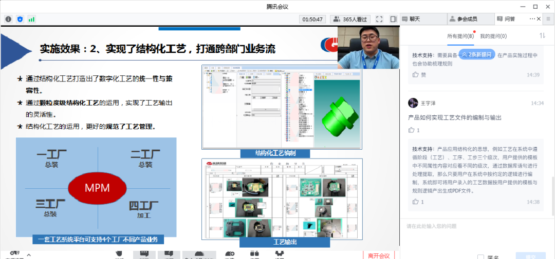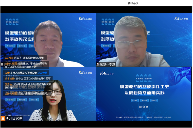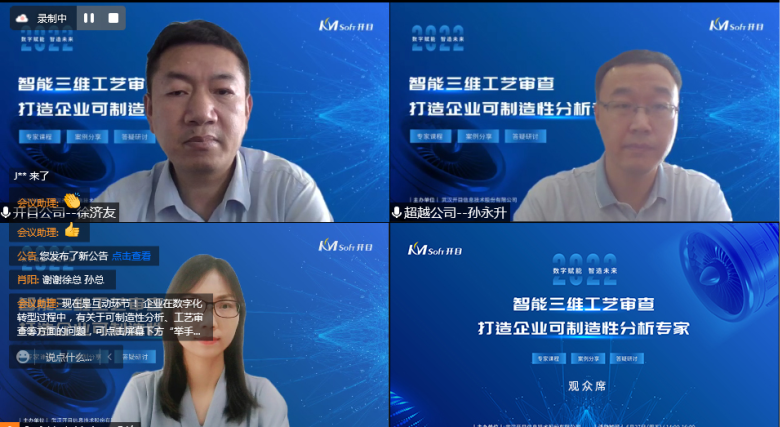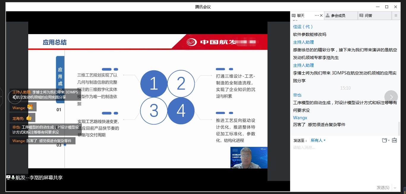 3DMPS能识别航空发动机类复杂零件所有制造特征吗?航发集团使用3DMPS 生成NC代码吗?与CAM 如何衔接?3DMPS可以一次性生成工序过程图吗?连线研讨环节,参会嘉宾踊跃互动,徐总和李湉博士倾囊相授,就企业在三维环境下如何编制机加工艺,如何利用已有工艺知识通过3DMPS提升工作效率,推进机加工艺标准化、参数化、结构化进程发表专业意见,大家点赞不止。