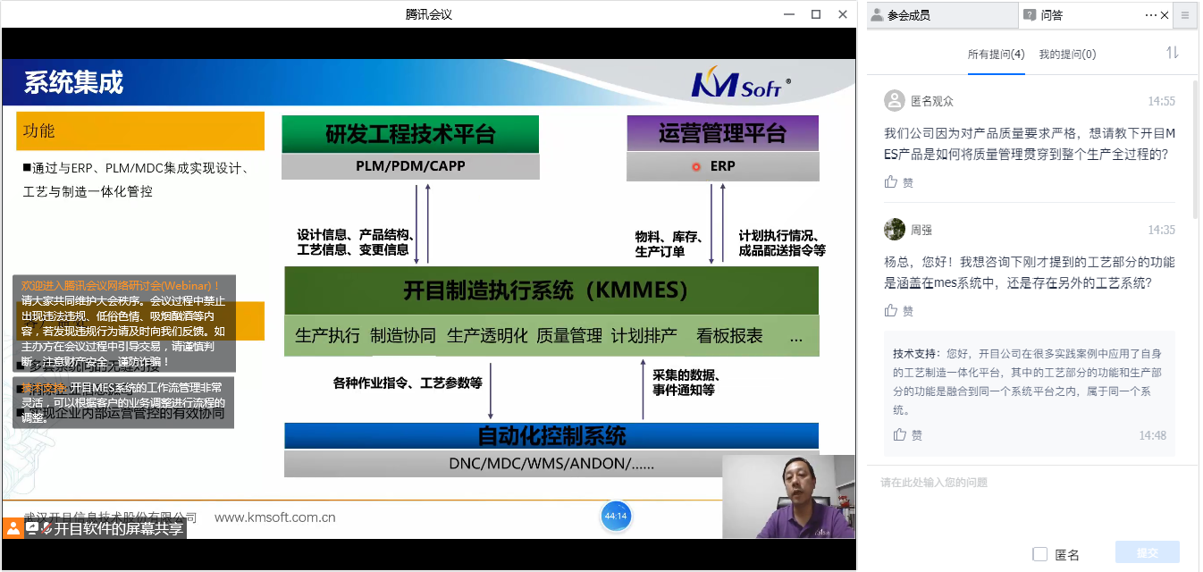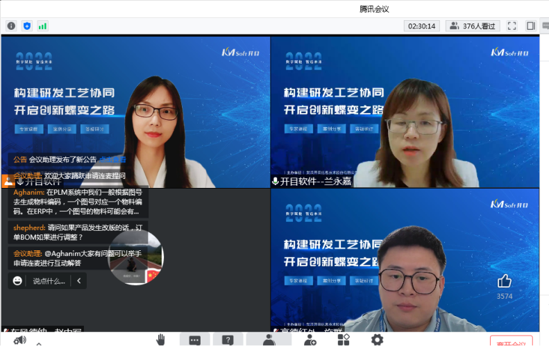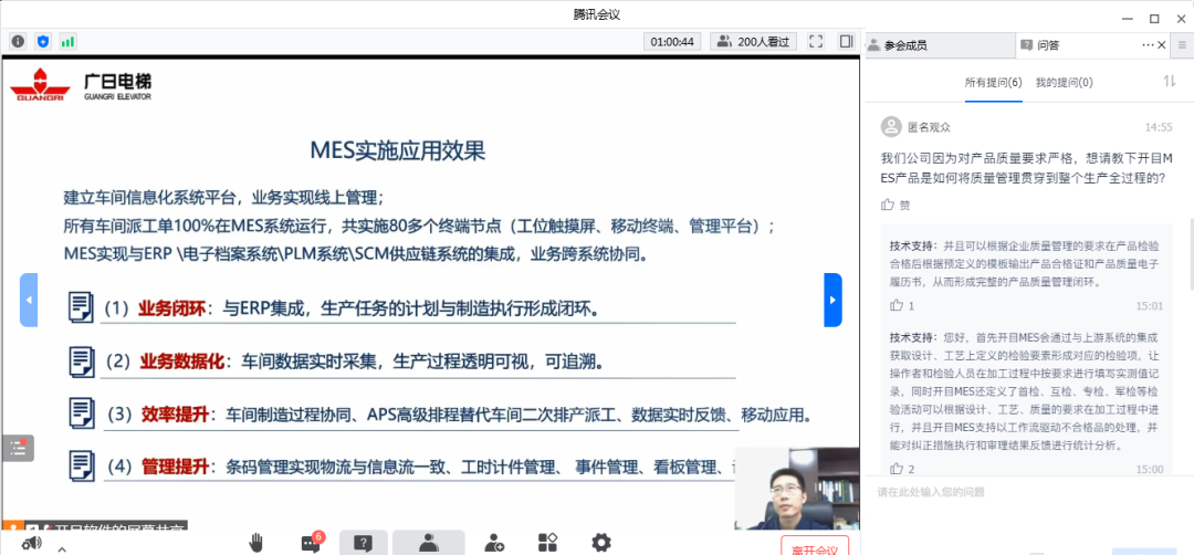 四机塞瓦产品结构复杂、个性化要求高,甚至件的产品生产交付模式,企业如何保障生产的合理交付?广日电梯作为特种行业设备是如何合理安排生产计划的?MES系统与工艺端的一体化应用主要体现在哪些方面?对于生产过程中的BOM变更,工艺变更开目MES系统是如何处理的?在活动直播间,参会观众踊跃互动,点赞不断,竞相评论,争相与专家连麦互动,三位专家分别从企业实际情况出发,为制造企业数字化转型MES实施答疑解惑,现场思想火花激情碰撞,为系列活动画上圆满的句号。