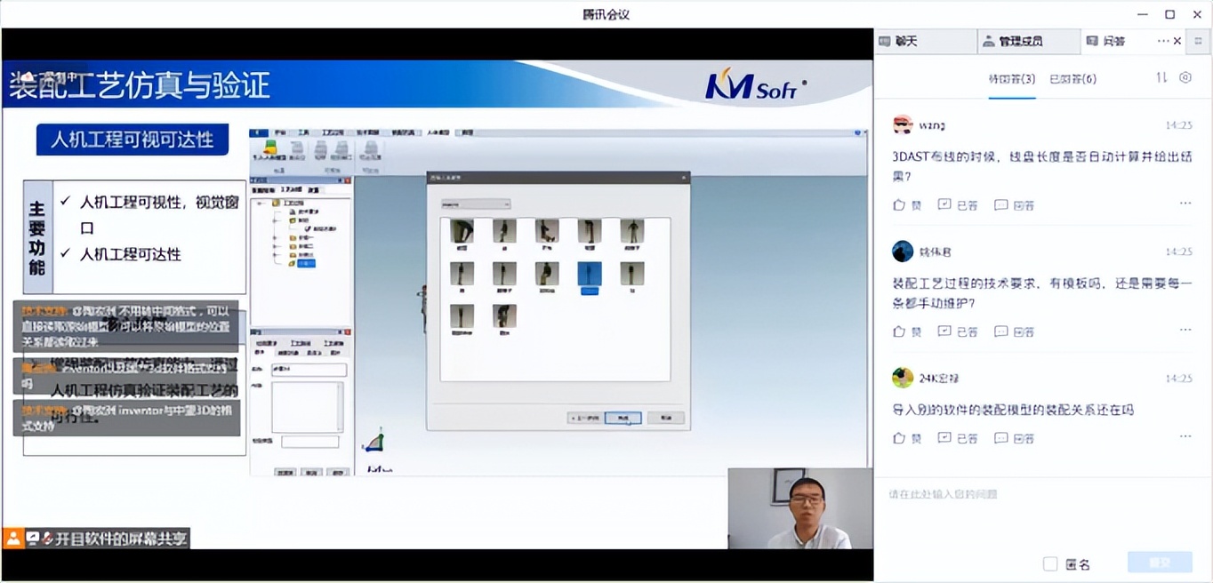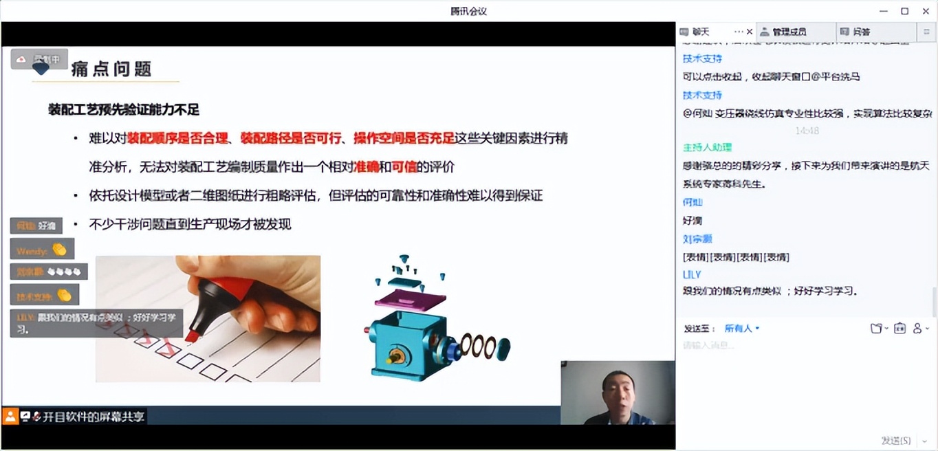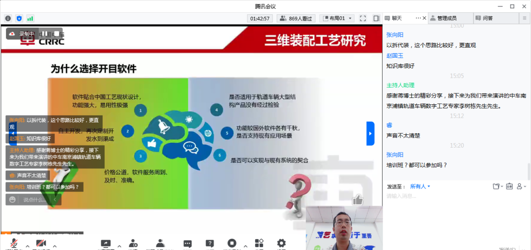 中车浦镇如何分阶段推进实施3DAST?航天企业是如何实现精密复杂的装配工艺?线缆长度是否自动计算并给出结果?能否引入企业的工装工具?工艺装备库是否可以自己扩展?在连麦互动研讨环节,大家纷纷踊跃参与连线互动,探讨制造企业如何部署和应用三维装配工艺规划与仿真系统,专家们给以制造企业细致的回复、专业的建议获得参会嘉宾的一致好评。