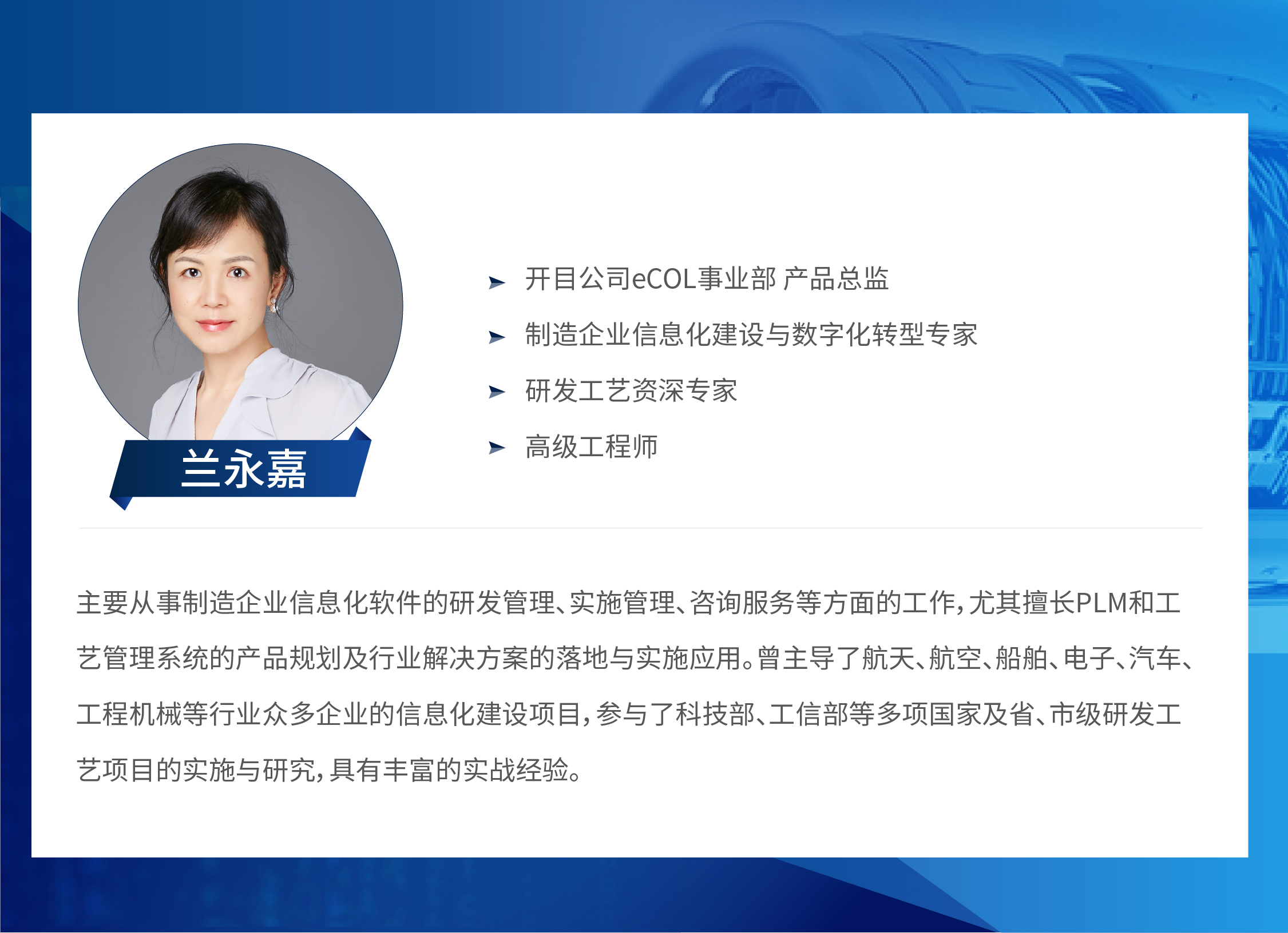 本期研讨会特邀英国正版365官方网站eCOL事业部产品总监兰永嘉女士、东风德纳车桥有限公司制造信息化专家赵中军先生、高德红外工艺信息化专家施群先生做客开目线上直播间,专家将全程在线答疑,与来宾深入探讨开目“研发工艺协同”的优势特点与实际落地应用。
