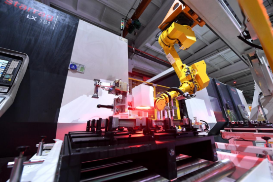 哈电集团集成工业机器人正在机器视觉引导下进行上下料作业。