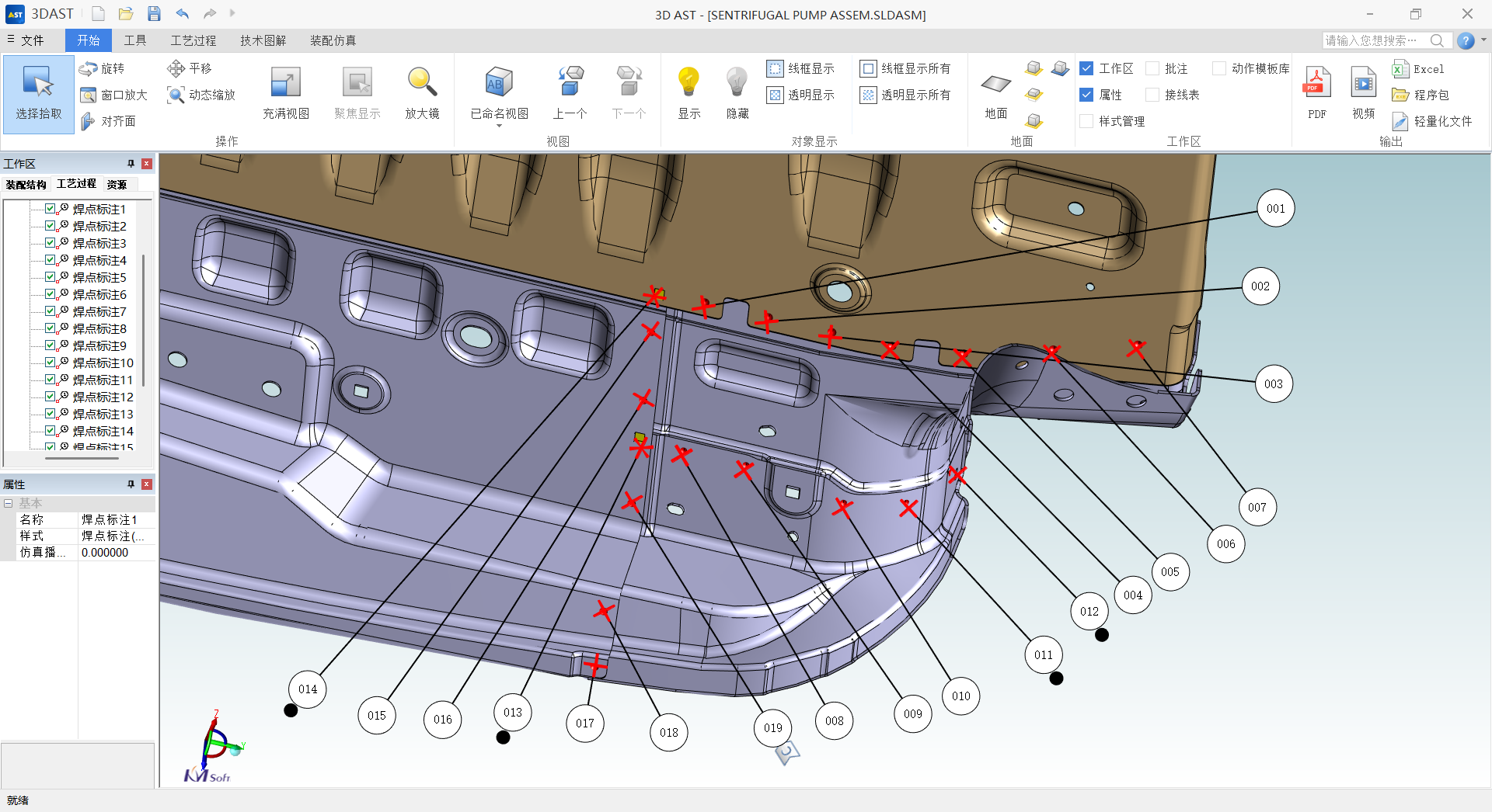 3DAST 18.0 深度融合汽车行业焊接工艺标准,新增焊点标注、焊缝标注等多种功能,用户可通过简单的操作,在三维模型中快速、精准地完成焊点标注,为焊接工序提供清晰、准确的指导依据,有效提高焊接质量,缩短汽车产品研制周期。