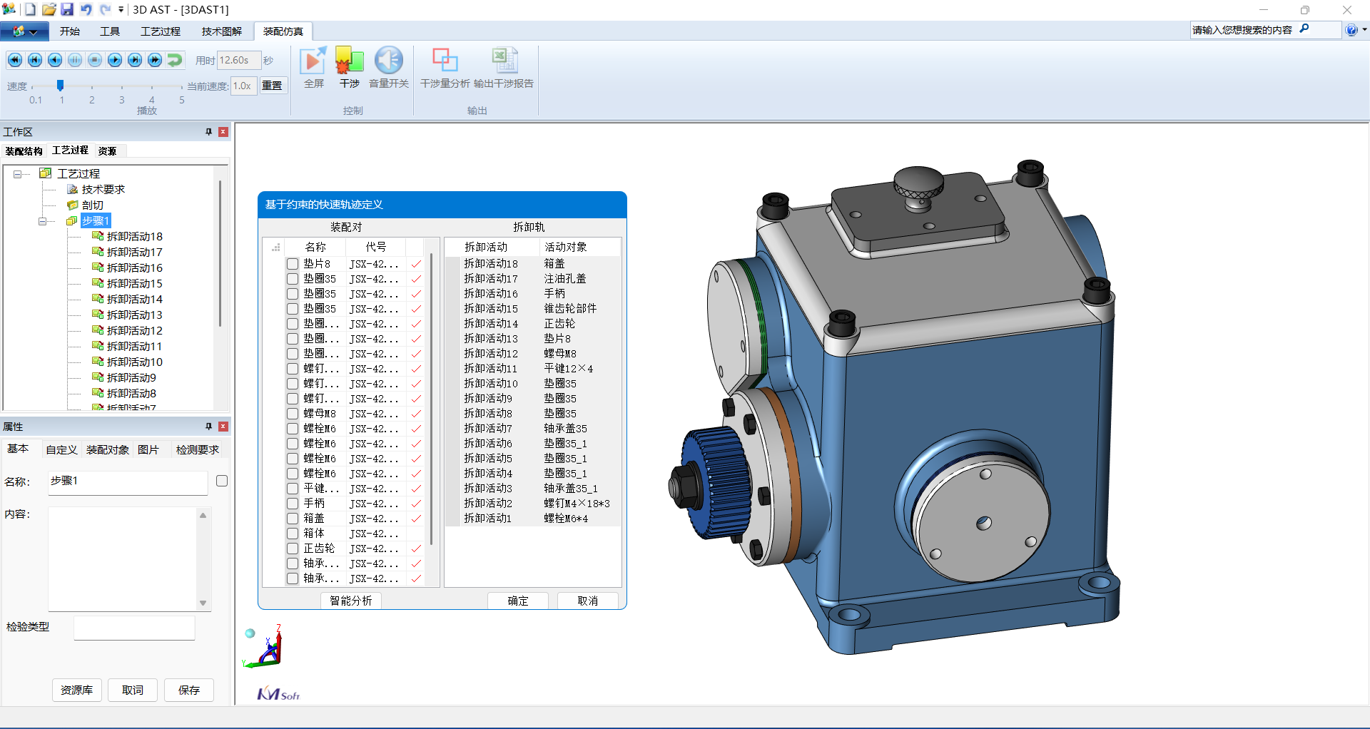 3DAST智能拆卸功能,可以基于零件空间位置与接触关系,自动推荐该工序零部件的拆卸顺序与运动轨迹。这极大地简化了三维装配工艺的制作流程,让工程师从繁重的手动操作中解脱出来,减少了因人为失误导致的设计返工,加快了产品从设计到生产的进程,对于整体三维装配工艺制作操作效率提升60%以上。