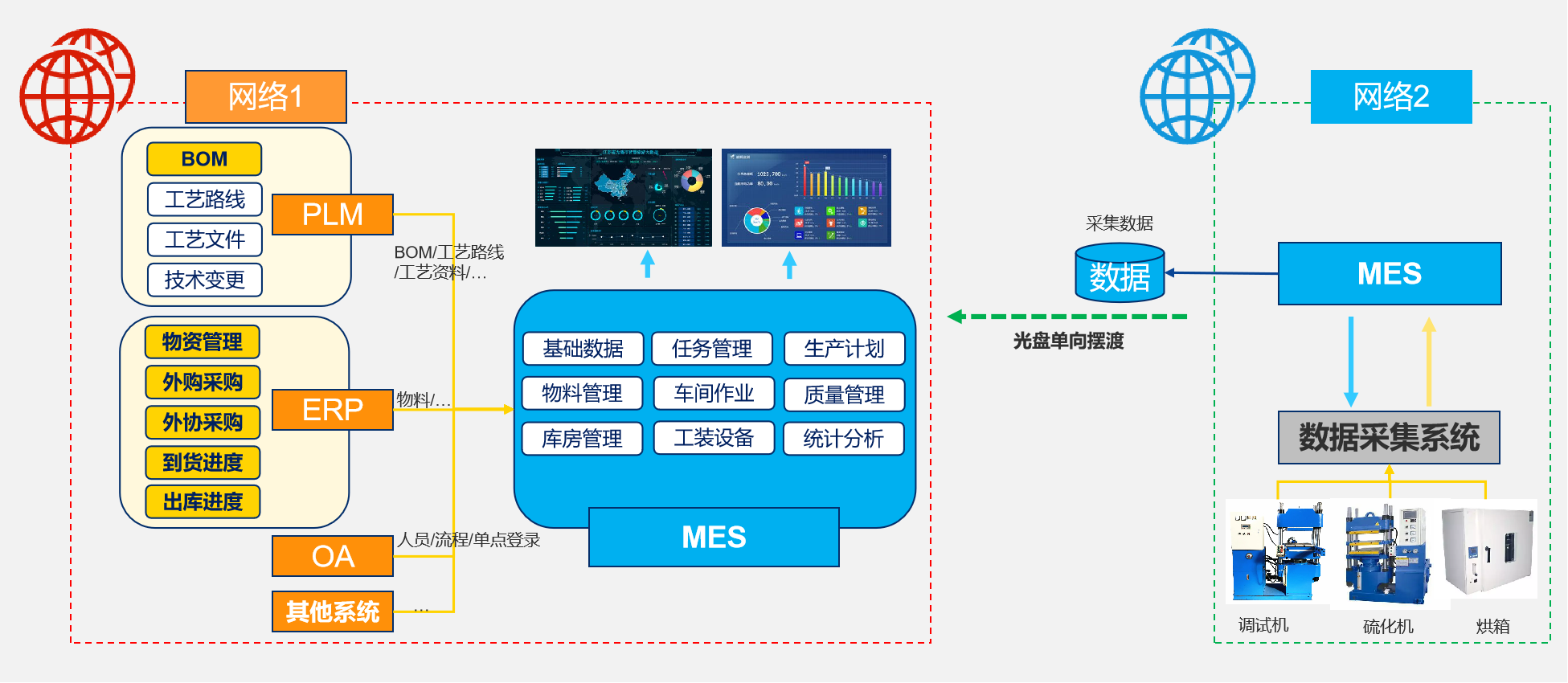 开目方案采用 “光盘单向摆渡” 技术,在满足安全隔离规范的同时,实现生产工单、工艺文件、质量记录等核心业务数据安全流转,为跨网络协同搭建可靠数据通道。