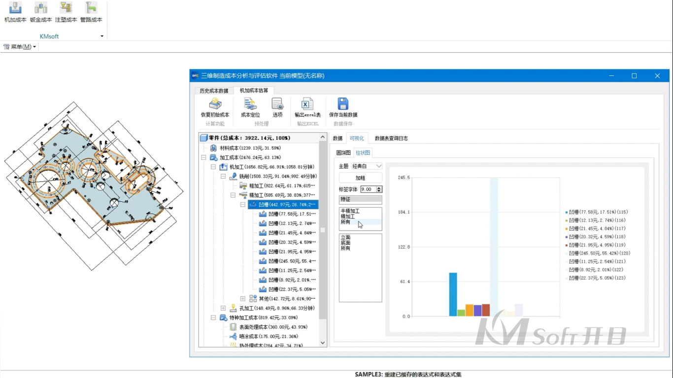 开目3DDFC通过成本结构树实现特征级成本拆解,结合饼图、柱状图可视化呈现成本占比与高成本部位分布。支持可视化结果与模型特征高亮联动,精准定位结构优化、工艺改进的核心靶点,为成本管控提供可量化、可落地的决策依据。